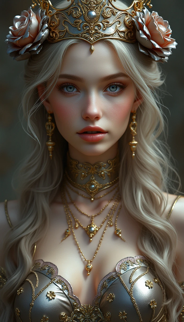 style of Samdoesart, style of Artgerm, a book cover with a metallic woman with a simple metallic crown with ornaments, dark blonde hair, the cover should look elegant, with silver roses, golden details and ornaments,
