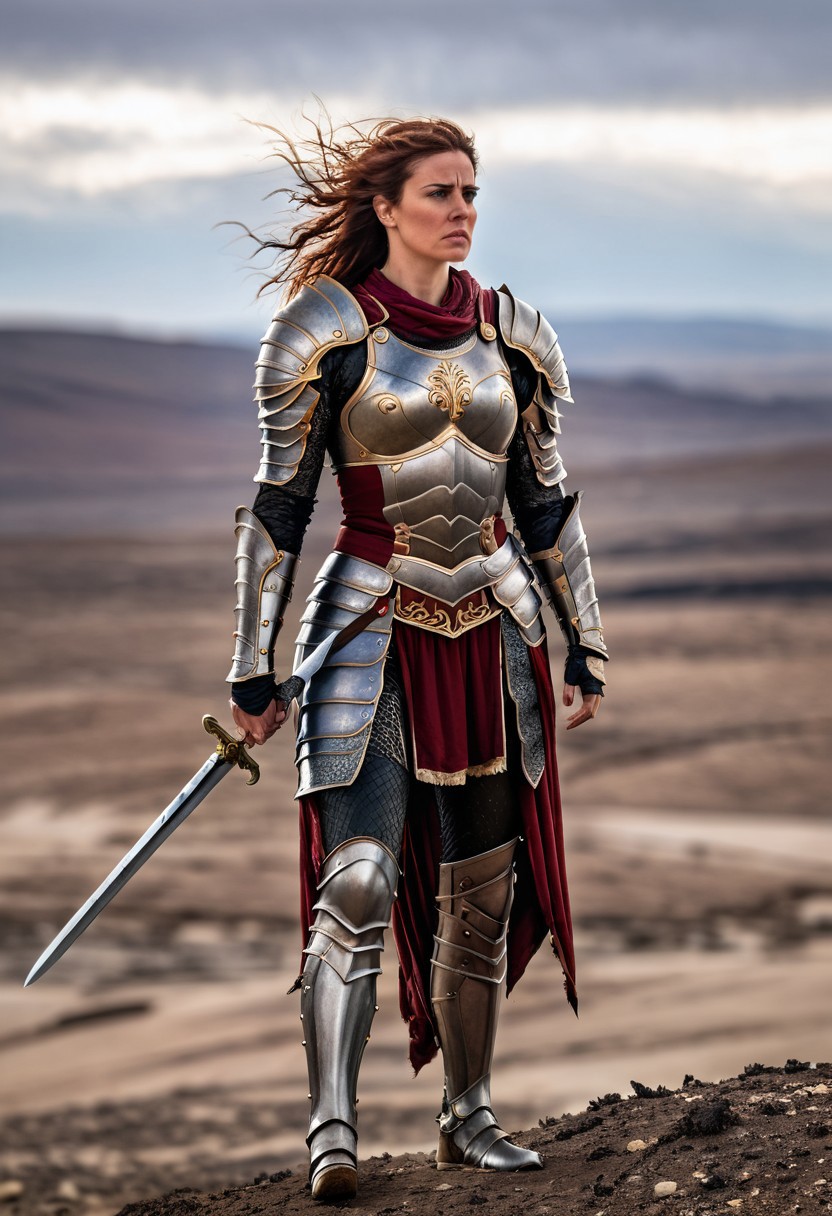 A warrior queen is stood on a desolate, windswept landscape. She is in armour and is carrying a sword.