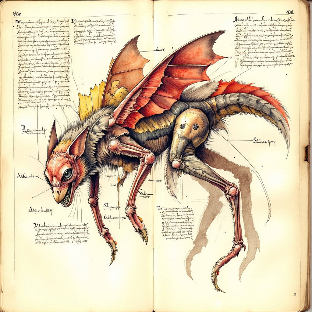 anatomysketch, watercolor illustration, closeup view of half the underside of an animalistic monster in the style of an anatomical wildlife sketch journal, focusing on intricate natural details and artistic use of color, with dynamic lines and transparent washes, with handwritten notes and embellishments in the margins. The monster sketch highlights the texture of its vivid feathers, as well as it's face like a bat, its whiskers and filaments, and fragile limbs, with visible brush strokes and sketchy ink lines, with red gray yellow and brown themes, on antique stained paper, by egon schiele