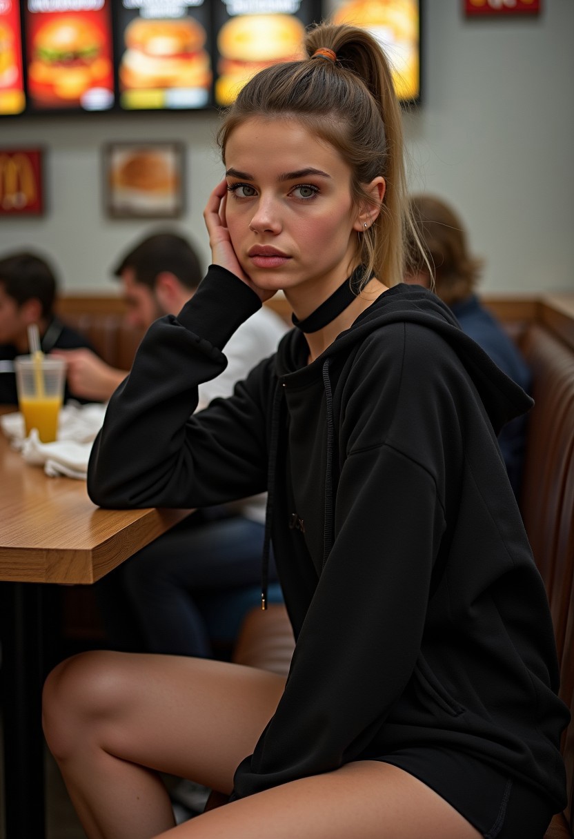 amateur photo, low-lit, overexposure, Low-resolution photo, shot on a mobile phone, nighttime, noticeable noise in dark areas. young woman, 18 yo (european:1.6) girl, , grey eyes, medium breasts, skinny, thin, petite blonde, grey eyes, ponytail, dark eyeliner, orange eyeshadow, natural lip color, black collar, hoodie, shorts, sneakers, seductive pose, right hand near the neck. Girl is sitting by table in macdonalds restaurant The background shows macdonalds restaurant with people eating, muted color tones. .