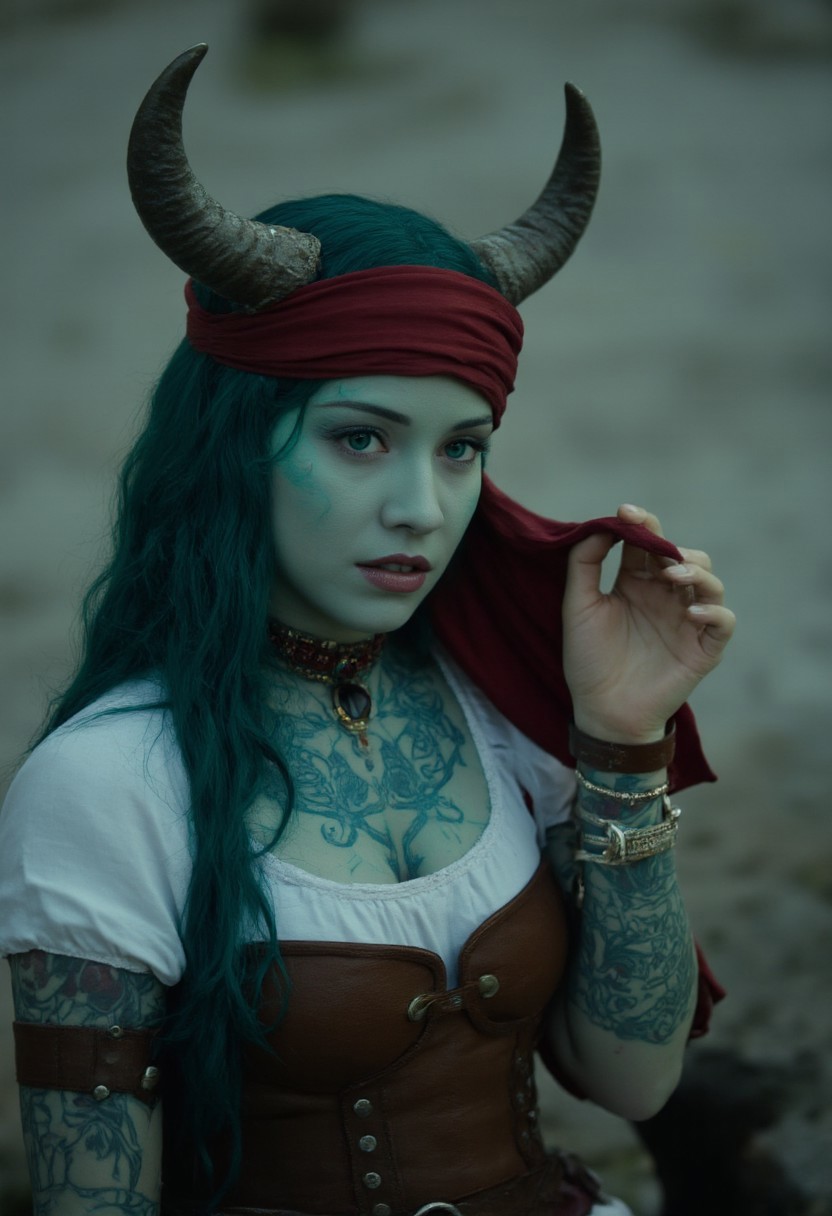 Real life 4k hdr movie still of a A fantasy female character with turquoise skin, standing in a three-quarter view, her body turned slightly to the side, but her face is directed toward the viewer. She has long, wavy teal hair, braided and flowing over her left shoulder. Two large, curved, dark gray horns emerge from the sides of her head, curving back and outward. She wears a red cloth tied as a headscarf, with loose ends hanging down. Her eyes are large and expressive, with bright blue irises. She has tribal-like turquoise tattoos running down her face, neck, and arms. Her right arm is adorned with a detailed, intricate tattoo in a Celtic design. She is dressed in a medieval-style outfit: a white blouse with a deep neckline, a brown leather corset with metallic elements, and leather straps around her arms and waist. Her earrings and jewelry are made of red stones, matching the accents on her headscarf. The style is highly detailed, with a focus on the contrast between her mystical appearance and realistic textures. <lora:FluxMythP0rtr4itStyle:0.8> MythP0rt, <lora:aidmaImageUpgrader-FLUX-V0.1:0.33> detailmaximizer, <lora:aidmaMJ6.1-FLUX-V0.1:0.5> midjourneyv6.1,