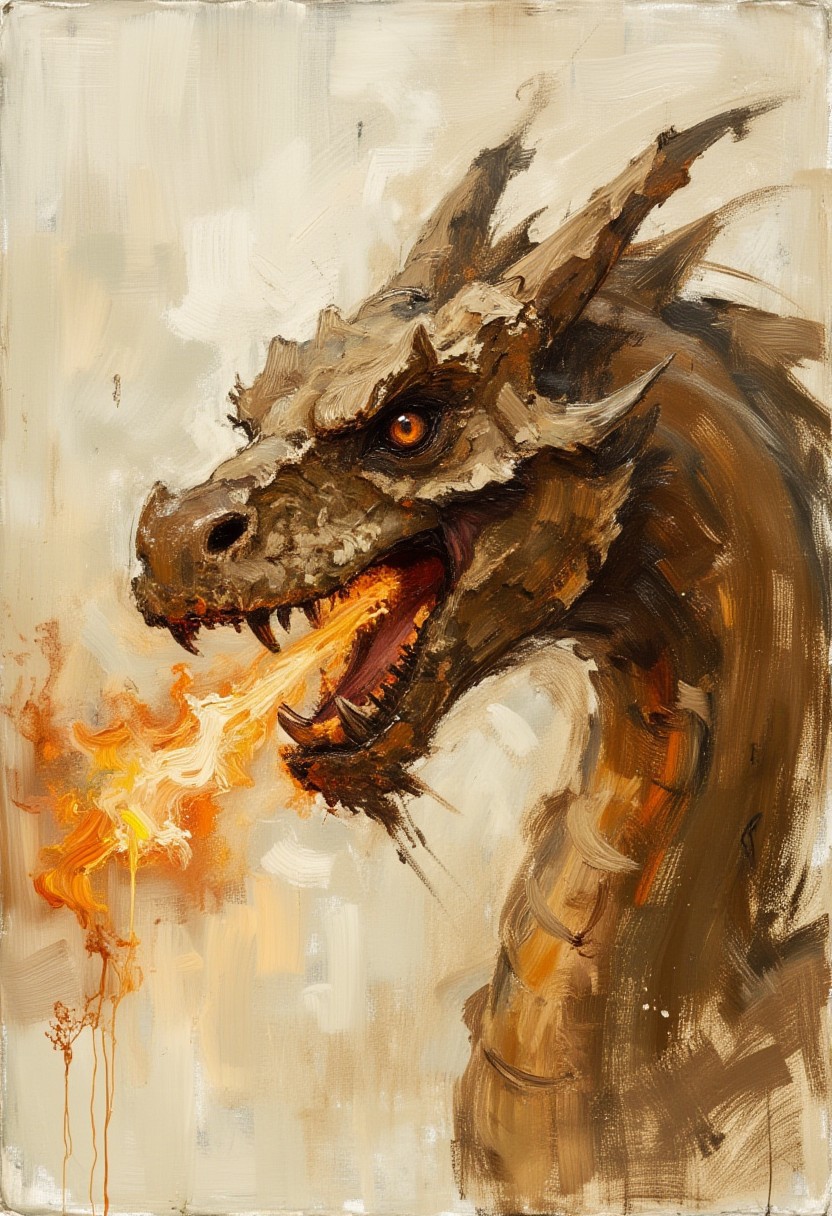 sketch painting of a dragon spitting huge fire,spitting fire on 3 quarter of picture, closeup on face, wide open mouth, forked tongue, very precise and numerous details on the scales, shiny scales, thick and solid scales, thorns on the head, ferocity, smoke, fire, rage