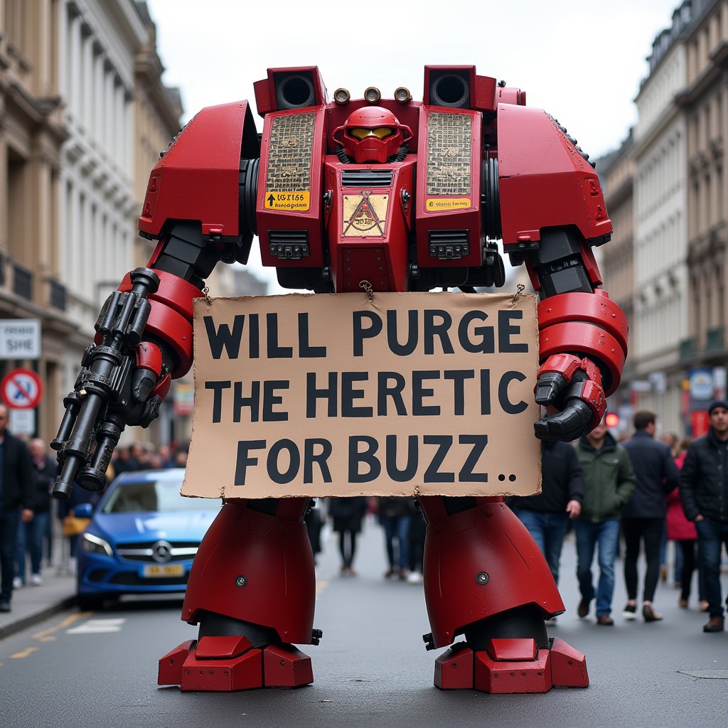 A huge red space marine dreadnought stands on a busy street holding a huge sign which reads "WILL PURGE THE HERETIC FOR BUZZ"