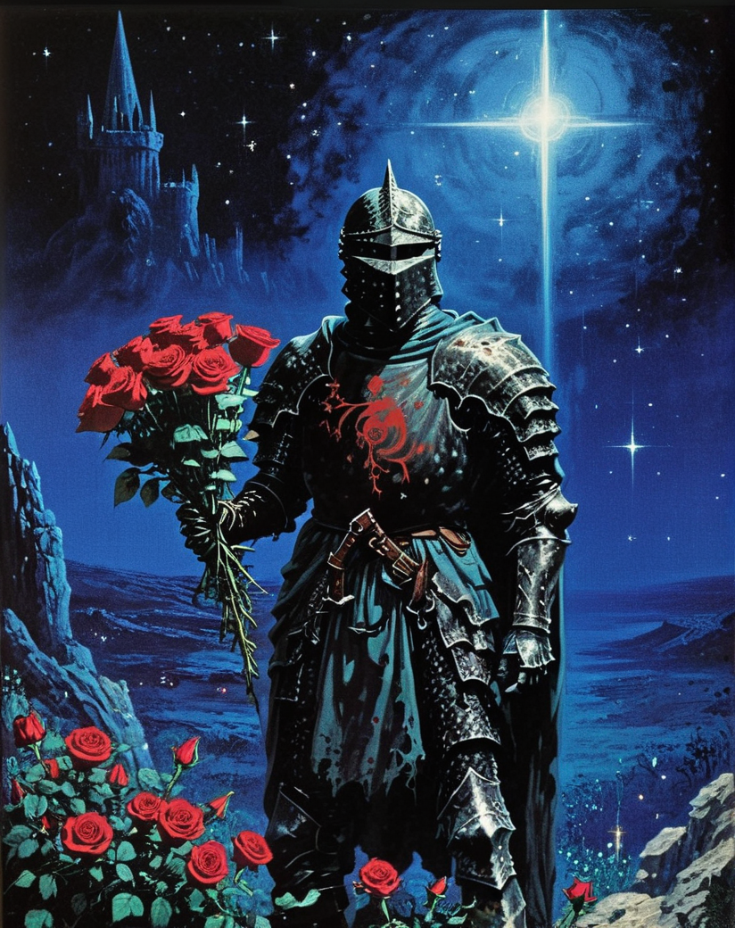 1970's dungeons and dragons dark fantasy artstyle, a knight holding a bouquet of red roses with blood, grain, cinematic, realistic, night, stars, photo <lora:dark_fantasy:1>