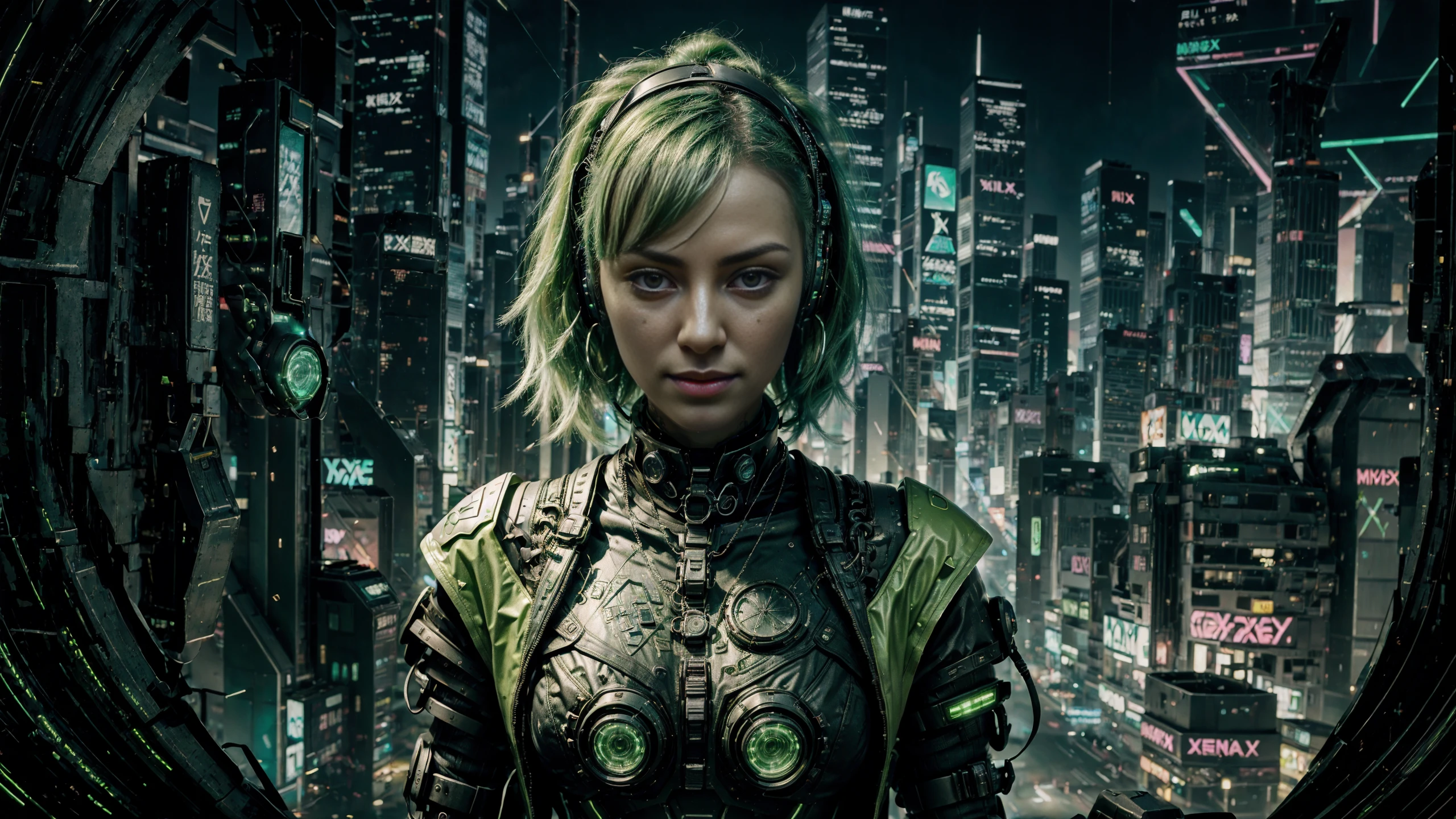 Kelly Green hair (woman), (18 years old), cyberpunk, futuristic, (extremely detailed), extremely realistic, photography, (digital photo portrait), (Fujifilm XT4 Viltrox), (happy smile), (beautiful cyberpunk tokyo buildings landscape), (bright neon lights), screen holograms, kanjis, raytracing, hdr, high contrast, cinematic lights, backlight, (legs), (sharp focus), luminous Pastel Green robot armor, body lights, body circuits, necklace, zipper earrings, colorful, shadows, vibrant colors, pretty, beautiful, feminine, sexy, loving, in love, adorable, fashion <lora:Detail Tweaker LoRA add_detail:0.8> <lora:depth_of_field_slider_v1:5> <lora:SDXLrender_v2.0:0.9> <lora:CyberPunkV2:0.1> <lora:CyberpunkStyleV3:0.7>