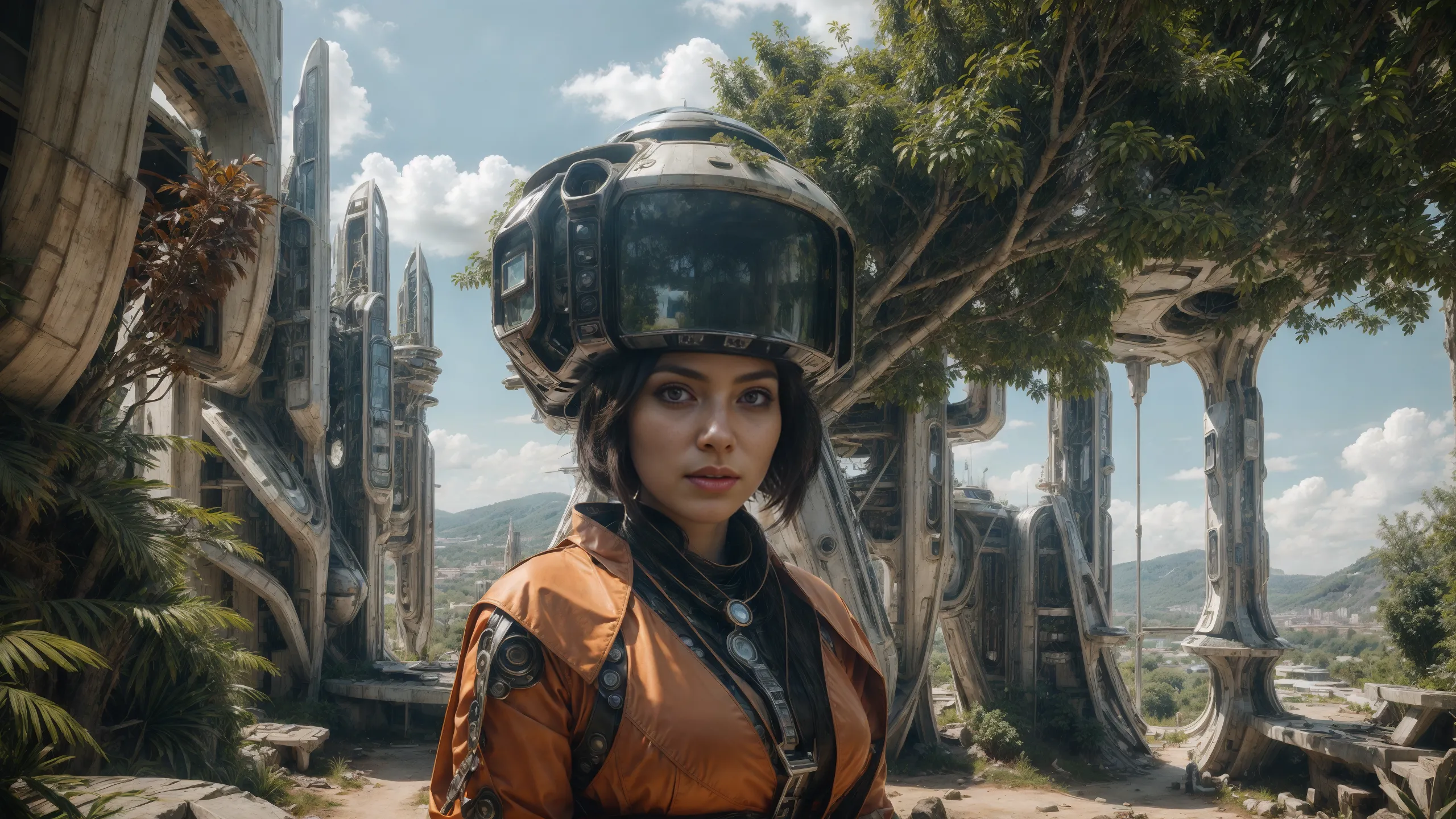 (young Liechtenstein citizen woman:1.2), cyberpunk, (futuristic, scifi), planet,afro medium brown hair, strange jungle, cabin, river, (screen, futuristic building, robotic machines), 8k, close-up photo portrait, photography, medium long shot, Fujifilm XT-4 Viltrox, (standing:1.2), necklace, Burnt Orange (miniskirt), (legs:1.2), (extremely detailed), extremely realistic, best quality, hdr, natural light, ethereal light, sharp focus, film grain, skin pores, textured skin, (pretty, beautiful, lovely, adorable, (smiling), (happy), feminine, cute, sexy:0.8), bright sunny sky, reflections, high contrast, shadows, <lora:Detail Tweaker LoRA add_detail:0.8> <lora:depth_of_field_slider_v1:5> <lora:1970RetroFuturism:0.3> 1970retrofuturism <lora:Aztec Style:0.3> <lora:cyber:0.3>