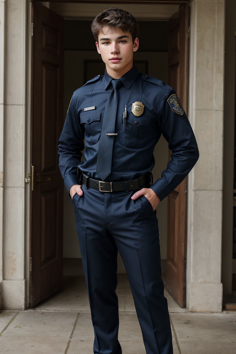 realistic, sfw, an attractive 18 years old fit caucasian boy standing, smug, full body shot, police uniform, <lora:Joe_Donovan_GV:0.7>