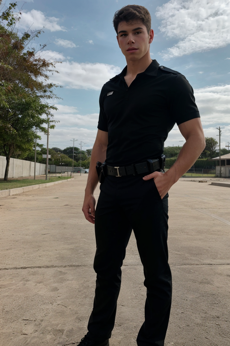 realistic, sfw, an attractive 18 years old fit caucasian boy standing, smug, full body shot, police uniform, <lora:odei_jainaga_lora:0.7>, odei_jainaga,