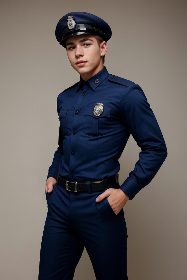 realistic, sfw, an attractive 18 years old fit caucasian boy standing, smug, full body shot, police uniform, <lora:Gabrieltwink18 V3 (Gabrieltwink18):0.7>, Gabrieltwink18,
