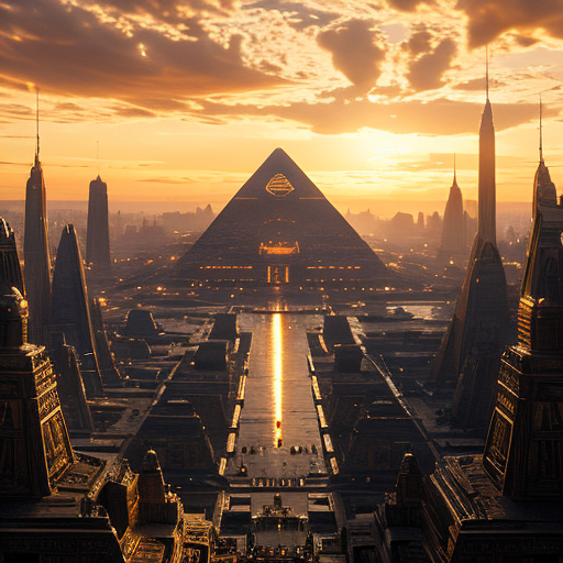 <lora:Year_3000_Movie_Stills:1> ArsMovieStill, A movie still from the year 3000s, The image is a digital illustration of a futuristic cityscape with a large pyramid in the center. The pyramid is the Great Pyramid of Giza located in Egypt. It is a tall triangular structure with a pointed top and a pointed bottom. The sky is filled with orange and yellow hues indicating that it is either sunrise or sunset. The city is densely populated with buildings and skyscrapers and there are several other tall structures scattered throughout the city. The buildings are lit up with bright lights creating a dramatic and eerie atmosphere. The overall mood of the image is one of awe and wonder at the grandeur of the pyramid., scenery, no humans, cloud, sky, building, cityscape, city, outdoors, cloudy sky, sunset