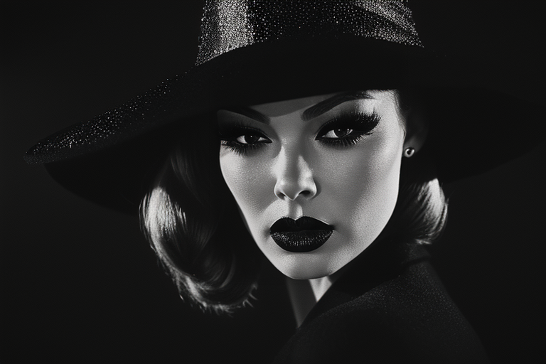 <lora:50s_Noir_Movie:1> ArsMovieStill, 50s Noir Movie Still, The image is a black and white portrait of a woman's face. She is wearing a large wide-brimmed hat that covers her head and extends to her forehead. The hat is black and appears to be made of a shiny material possibly fabric or a similar material. The woman's eyes are closed and her expression is peaceful and serene. She has long dark eyelashes and her lips are painted with a bold dark lipstick. The background is completely dark making the woman the focal point of the image. The lighting is dramatic highlighting her features and emphasizing her features.