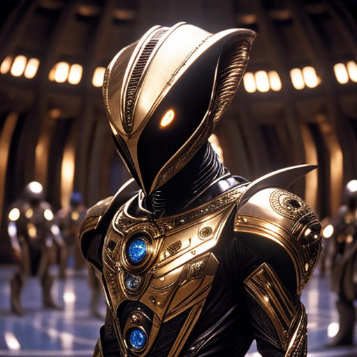 <lora:Year_3000_Movie_Stills:1> ArsMovieStill, A movie still from the year 3000s, The image is a close-up of a humanoid creature with a large head and a pointed nose. The creature appears to be made of metal and has a metallic appearance. It has a round head with two large eyes and a small mouth. The body of the creature is covered in intricate patterns and designs and it is also covered in a metallic armor with gold accents. The armor has a large circular emblem on the chest and a chain-like design on the arms and legs. The background is blurred but it seems to be a futuristic setting with various objects and machinery., solo, blurry background, blurry, upper body, looking at viewer, male focus, smile, alien, 1boy, black eyes