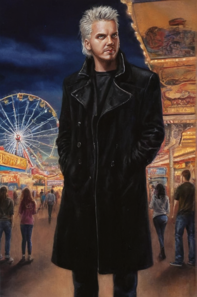 r0y0 style, illustration of d4v1d man, at santa cruz boardwalk, night, black coat, highly detailed painting, high contrast <lora:r0y0:0.8> <lora:d4v1d:1>