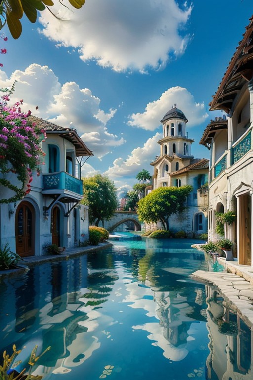 ((masterpiece,best quality)), absurdres, <lora:WhiteBuildings:0.8>, whtBldng, sky, day, cloud, water, tree, blue sky, plant, flowers, tropical, reflection, fantasy, pillar, waterfall, arch <lora:add_detail:0.92>,