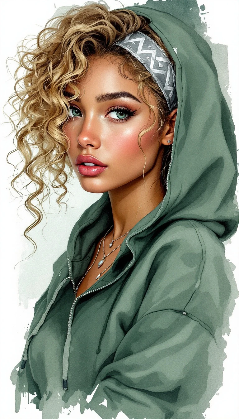 watercolor technique evoking the runny style, reminiscent of art by Catherine Abel, art by Pino Daeni, A biracial female, 21 years old, college student, wearing a heather green hoodie, curly blond hair with a silver headband, Muted Beauty, Bold outline, Dark outlines, Color Grading, European Features, Victorian-inspired illustrations, hatched shading, matte finish,