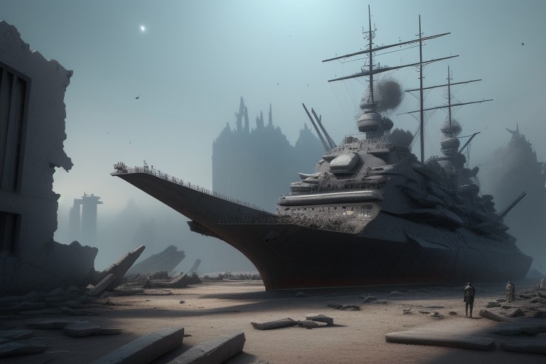 a space pirate battleship among the ruins of an advanced, futuristic city