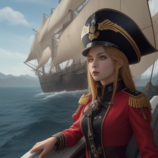 Regal female Crimson Pirate Admiral, feminine seductive Villain Golden Monster Skull Helmet with Big Captain hat Full View, airship