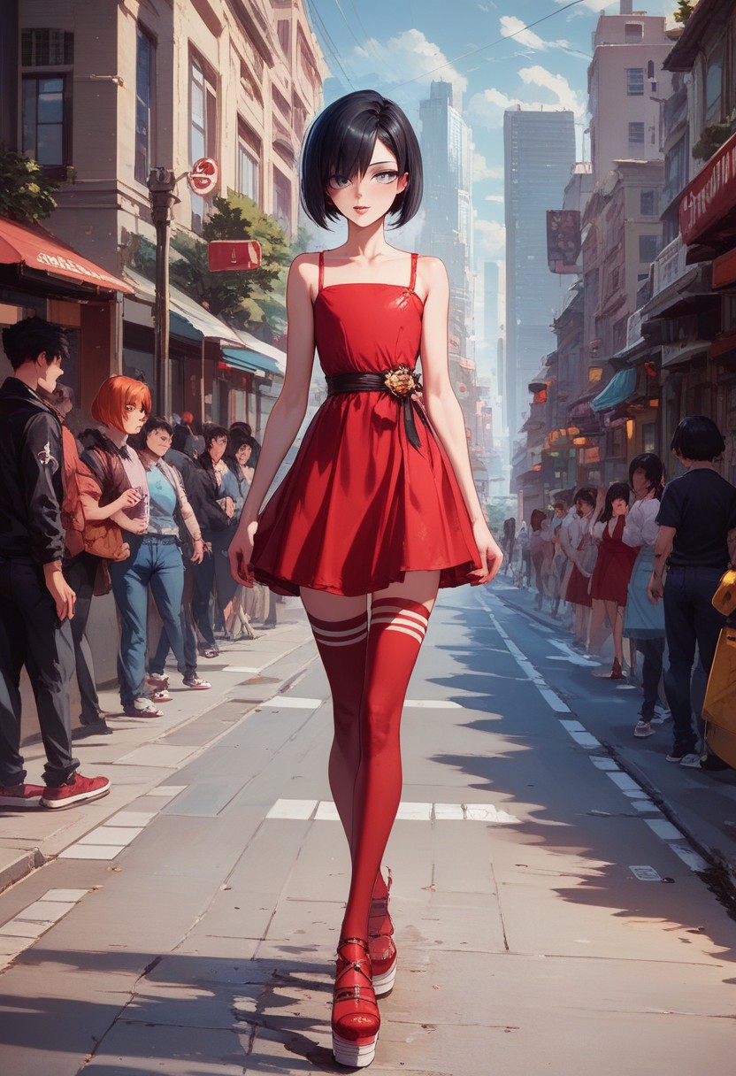 score_9, score_8_up, score_7_up, 1boy, femboy, otoko no ko, short hair, bob cut hair, black hair, grey eyes, gray eyes, feminine face, toned body, Shelly, walking, confident, whistling, reij-rosie, red dress, red platform strappy heels, red stockings, zettai ryouki, highly detailed, intricate, zzCitronLegacy, city, sidewalk, crowded, morning