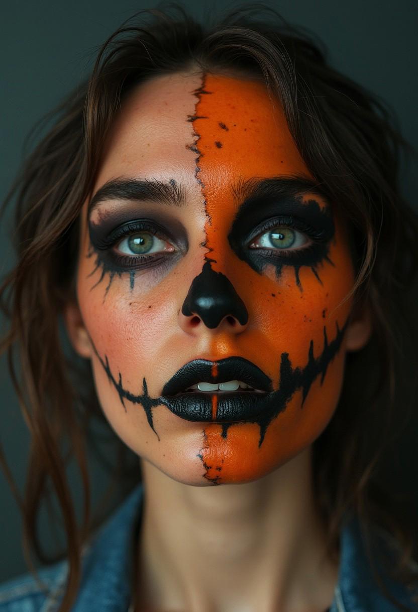 extreme closeup of a a beautiful female model, the face is split in the middle with the right side normal and only the left side with a grungy face-paint in the style of a carved pumpkin, black studio background
