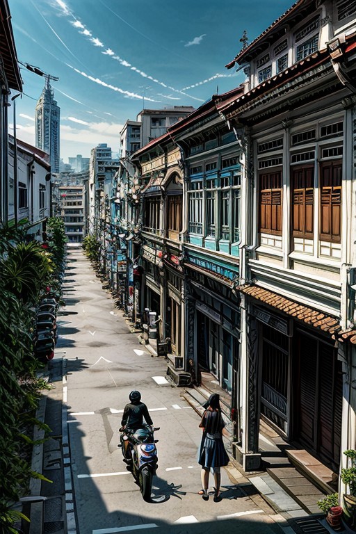perfect proportions, perfect perspective, 8k, masterpiece, best quality, high_resolution, high detail, photorealistic, architecture, building, (shophouse, historical old cityscape, skyscraper, scenery), art deco architecture, east asian architecture, traditional, ancient, rustic, vintage, historical, heritage, pedestrian arcade, narrow facade, long windows, street, alley, road, (outdoor:1.2), Southeast Asia, George Town, Penang, Taiwan, Tainan, Singapore, subtropical environment, people, crowd, motorcycle, bike, street market, street vendors, day, dawn, CyberpunkWorld
