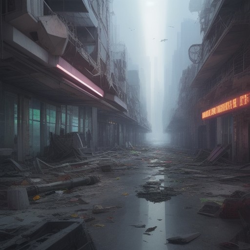 ruins of a high tech futuristic city with holographic signs still active yet damaged, and the wrecks of the futuristic flying vehicles littering the empty streets