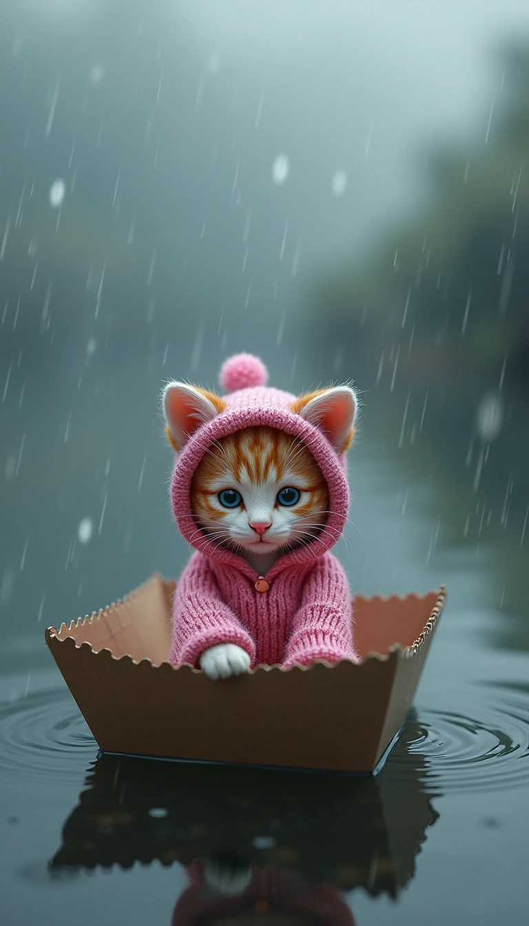 Hyper realistic knit kitten sitting in a paper boat made out of a chinese Takeout box, in a lake, stormy, alone on rainy day, pink sweater, pink rain hat, Hyperdetailed, realism, dynamic lighting, meticulously composed concept art, masterpiece, mystic fog, digital illustration, Volumetric lighting