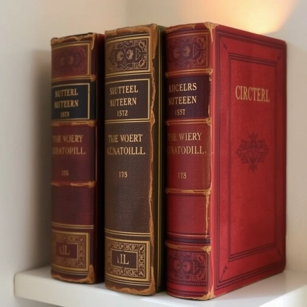 3 old books with beautiful covers. Gold-embossed letters on the spine of the book. The books stand in a row on a small shelf against a wall and light up the wall from within.