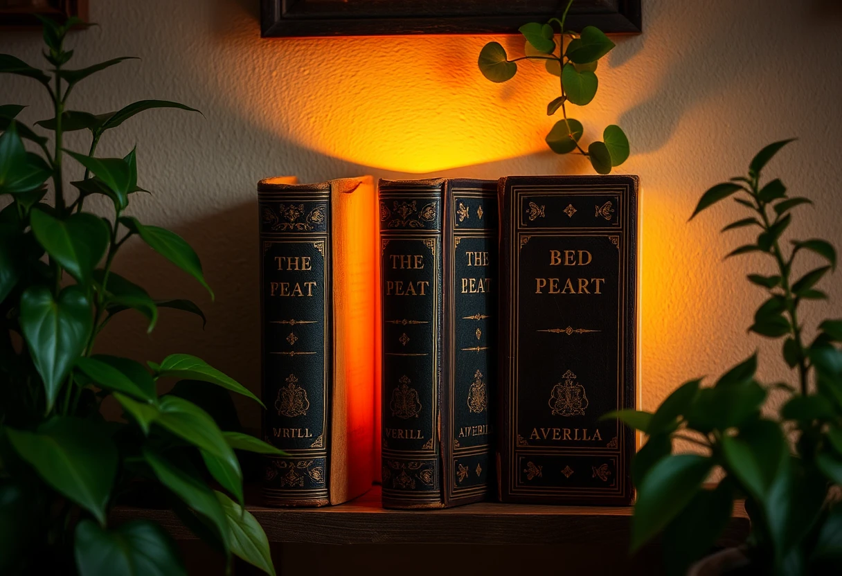3 old books with beautiful covers. Gold-embossed letters on the spine of the book. The books are arranged in a row on a small shelf against a wall in a cozy living room. There are green plants all around. There is Abed in the room, there is very little light and the 3 books shine from inside them upwards and onto the wall. On the wall there is a magical warm glow around the books.
