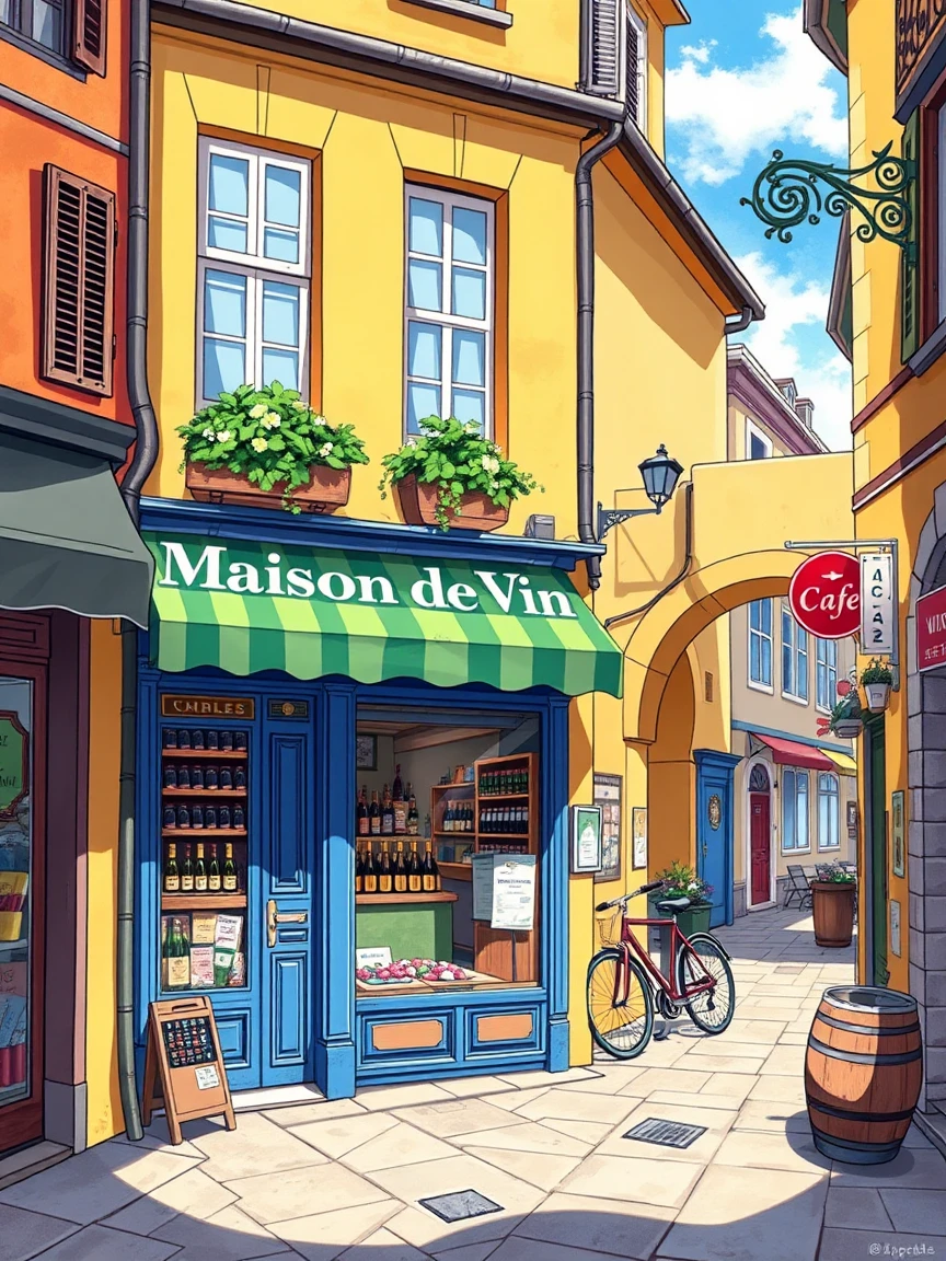Detailed and vibrant anime illustration depicting a charming European street scene. The style is illustrative with a focus on rich colors and intricate details. The layout features a narrow street with buildings on either side, showcasing a variety of storefronts. The central subject is a wine shop named 'Maison de Vin,' with a blue facade and a green and white striped awning. Above the shop, there is a window with a flower box filled with greenery. The building walls are painted in warm yellow tones, giving a rustic appearance. To the right, an archway leads to another street with a red cafe sign visible. The scene includes various elements such as a bicycle leaning against a wall, street signs, and a barrel outside the wine shop. The overall atmosphere is lively and inviting, capturing the essence of a quaint European neighborhood. Hayao Miyazaki, Hiroshi Nagai, Hergé and Studio Ghibli. High resolution, high cartoonish high intricate, ultra detailed, high quality, high sharpness, high contrast, beautiful, high octane render, high definition.