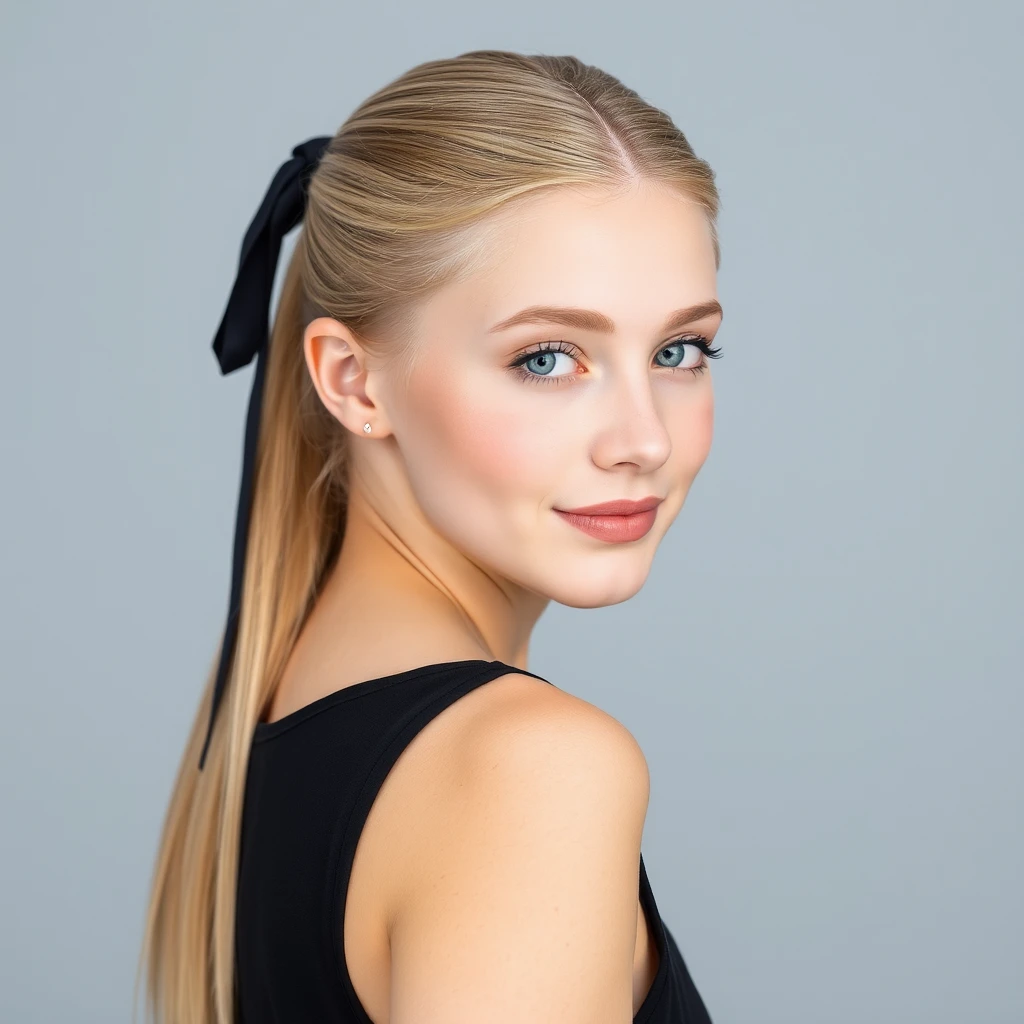 Image is a portrait-style photograph featuring a young woman with fair skin and long blonde hair tied back with a black ribbon. She has blue eyes, a subtle smile, and is wearing a black sleeveless top. The background is a plain, soft gray, which highlights her features. Her makeup is minimal, emphasizing her natural beauty. The lighting is soft and even, creating a gentle and flattering effect on her skin tone. She is facing slightly to the side, with her gaze directed towards the camera, exuding a calm and confident demeanor.