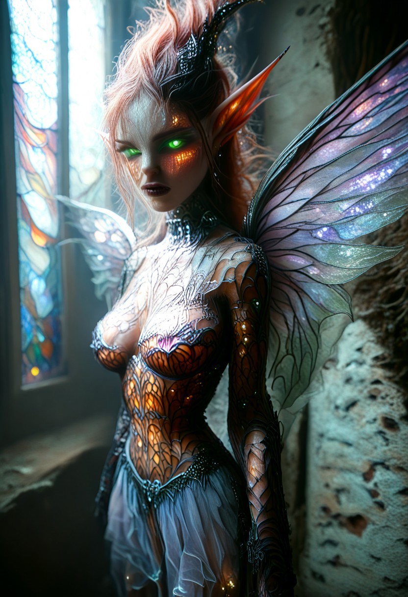 score_9, score_8_up, score_7_up, score_6_up, masterpiece, newest, 1girl, solo, masterpiece, wide shot, full body, dark-skinned-female Demon pointy-chin very-dark-skin purple-eyes copper-hair large-breasts green-dress short-skirt stained glass windows, -wings, Depth of field,facial expression style, GhostlyStyle, ArsMJStyle, dnddarkestfantasy , hourglass body shape, hkmagic, skin texture style, detailed skin pore, detailed skin, realistic skin, Glowing Stained Glass, elf, pin-up, succubus, femme fatale, tattoo