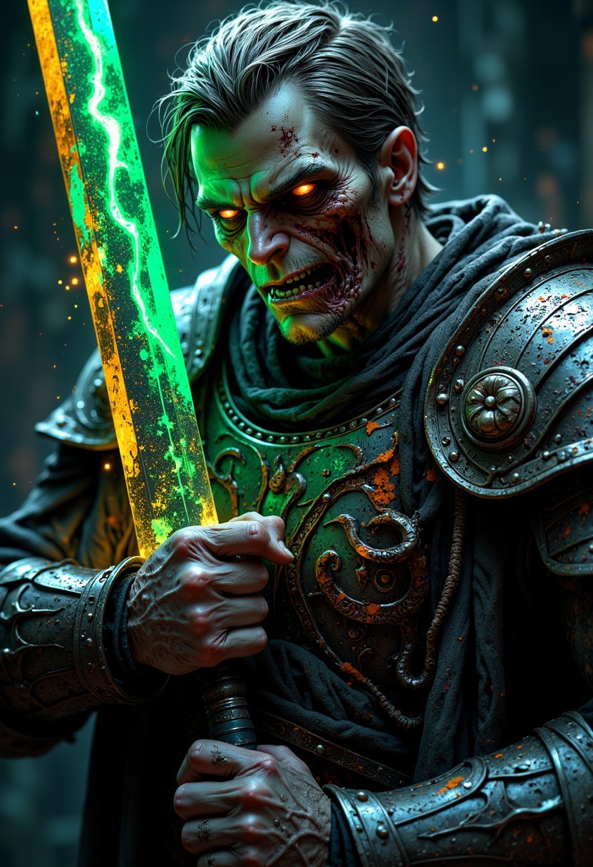 Cinematic photo of a horrifying zombie man with short, disheveled hair, wearing ancient Nordic armor reminiscent of Skyrim. His decaying hands grip a perforated carbon sword adorned with Nordic magical runes. The armor, once mighty, is now tattered with spectral flowers and vibrant acid colors seeping through the decayed metal. The eerie green glow from the sword and the spectral hues from his armor create a chilling, haunted atmosphere against a dark and foreboding background. The lighting emphasizes the ghostly glow of the sword and the eerie, vibrant details of the armor. The perspective is a close-up shot focusing on the upper half of his body, highlighting the grotesque details of his armor and the eerie, spectral light effects. Photography, high-resolution, dynamic, energetic. Optimized for FLUX. Enhancements: Ray tracing to create realistic reflections and shadows, adding depth to the eerie ambiance. Path tracing for precise lighting effects and accurate simulations of light interactions. Anti-aliasing for smooth edges and a clean, high-quality look. HDR (High Dynamic Range) for vibrant colors and enhanced contrast. Depth of field to emphasize the detailed foreground with a slightly blurred background for a dramatic effect. Motion blur for any movement to add a dynamic feel to the scene. Ambient occlusion for realistic shading and depth in crevices and corners.