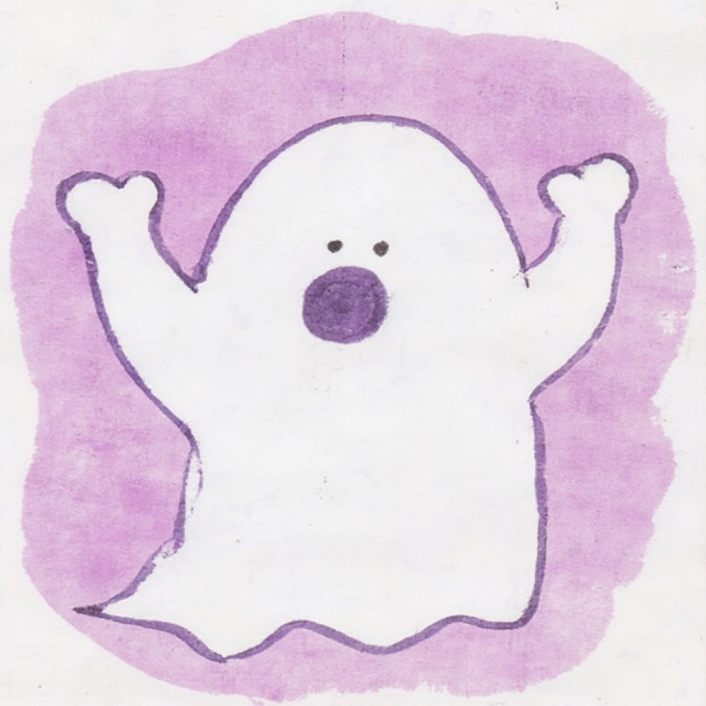 art by kumagaiM, tokugawa style ink painting, a cute eye ghost, arms up, blurred outline, purple pink white backdrop