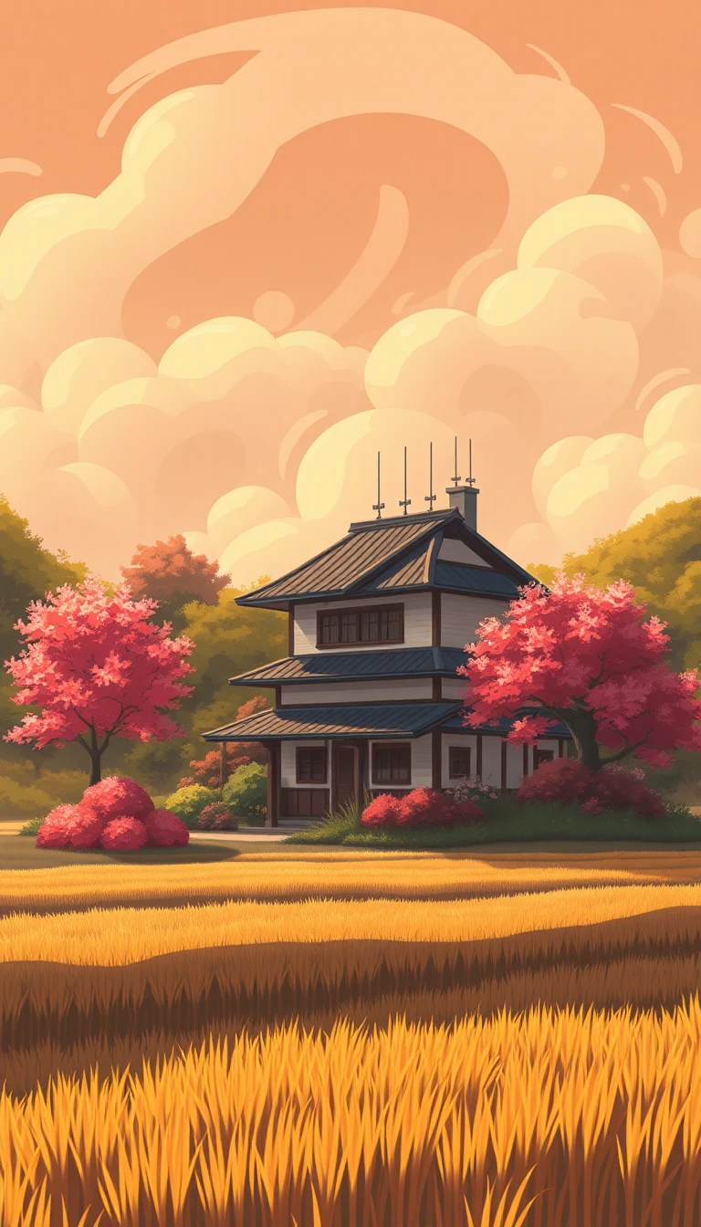 Image is a digital illustration depicting a rural scene with a traditional Japanese house as the central subject. The house is two stories tall, with a sloped roof and multiple antennas on top. It is surrounded by lush vegetation, including trees and bushes with pink and red foliage, suggesting a seasonal transition. The foreground features a field with rows of harvested crops, casting long shadows in the warm, golden light. The sky is overcast with large, swirling clouds, adding a dramatic effect to the scene. The overall color palette consists of earthy tones, with highlights of pink and red, creating a harmonious and serene atmosphere. Hayao Miyazaki, Hiroshi Nagai, Hergé and Studio Ghibli. High resolution, high cartoonish high intricate, ultra detailed, high quality, high sharpness, high contrast, beautiful, high octane render, high definition.