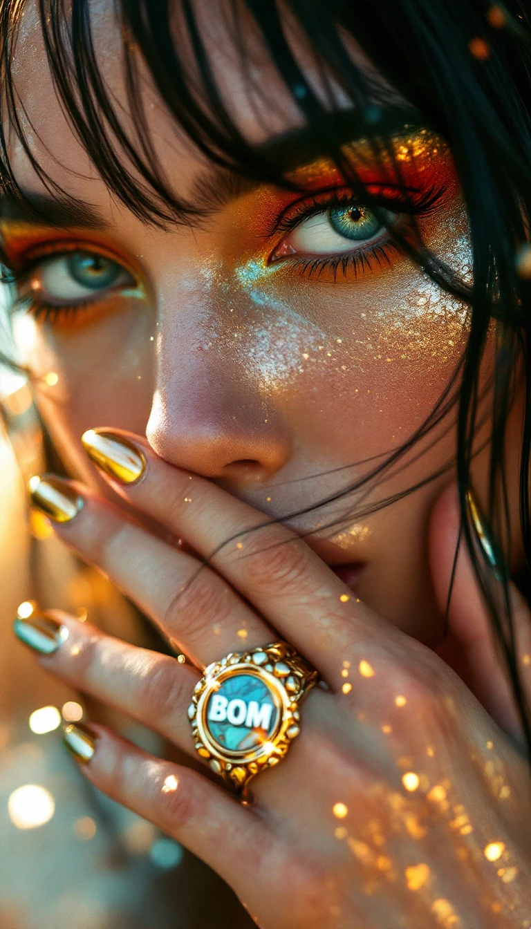 Macro photography for VOGUE ITALIA magazine. Vibrantly vulgar and BOMBASTIC beauty editorial in the style of CHUANDO & FREY. Beautiful INUIT supermodel BJORK with wide-set pale-green eyes and prominent epicanthic folds and pale freckles. She is looking away. Her long black hair is windswept and partially covers her face. Her hand partially obscuring her mouth. Finely manicured fingernails with shiny gold surface. Wearing a large silver ring with 3D "BOM" text in cyberpunk font style. She is styled in experimental avant-garde eye-makeup with metallic accents and matte textured vibrant color palette inspired by FRIDA KAHLO and marbling patterns of SPANISH Jamón. Low-angle extreme macro shot with framing of her face only. Low positioned bounce illumination using distressed red reflector and cracked gold mirror creating jagged reflection patterns and specular highlights. Hazy atmoshperic sun backlighting with partial lens flare. Visible water condensation and water mist, blurry rainbow