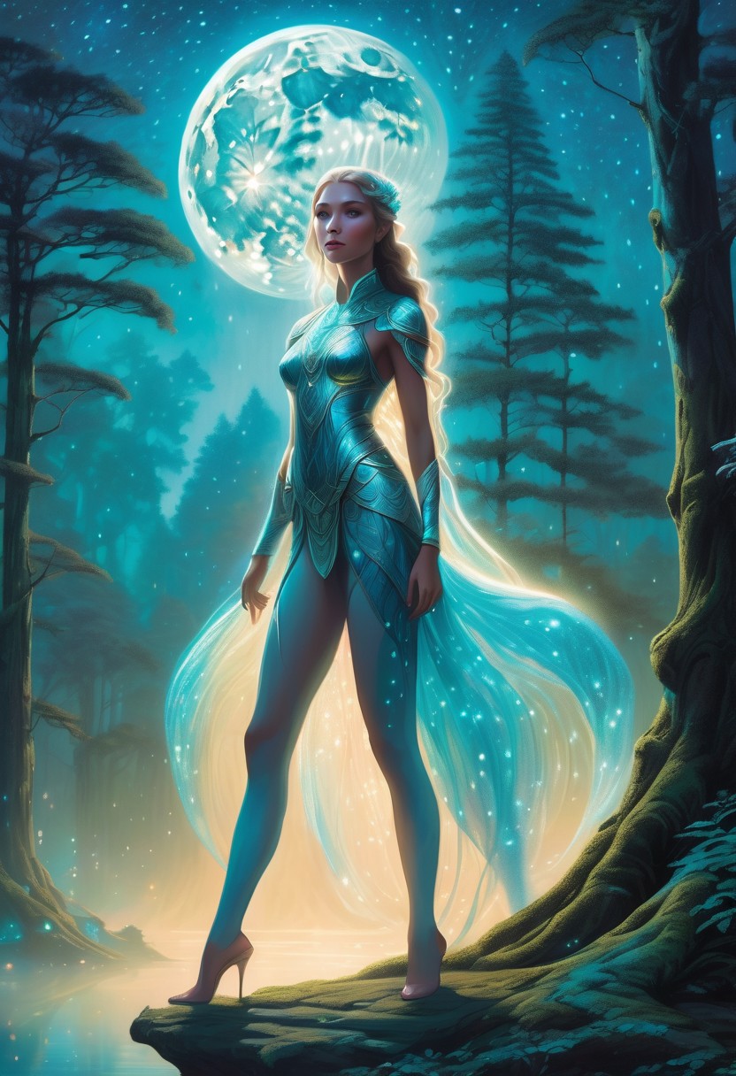 A mystical forest illuminated by glowing bioluminescent plants, with ancient, towering trees reaching the sky. In the foreground stands a captivating, beautiful woman dressed in a form-fitting, elegant outfit that highlights her long, toned legs. Her attire shimmers with magical symbols, and she stands confidently, one leg slightly forward, drawing attention to her poised stance. She gazes at a floating crystal orb in front of her, channeling energy, as ethereal creatures flutter in the misty air around her. A grand, ancient temple made of crystalline structures glows in the background under a giant moon, casting a soft light over the scene.