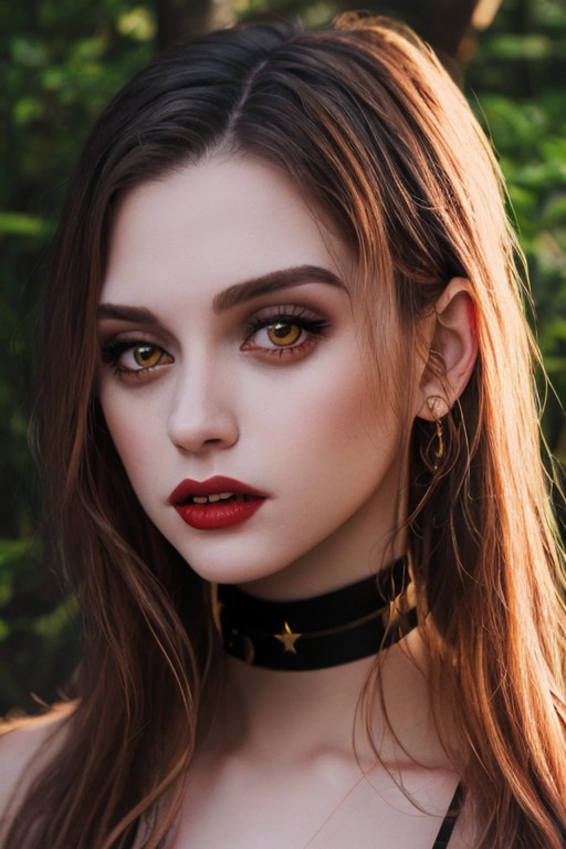 illustration, vampire girl, 23 years old, (beautiful:1.75), choker,closeup, forest background