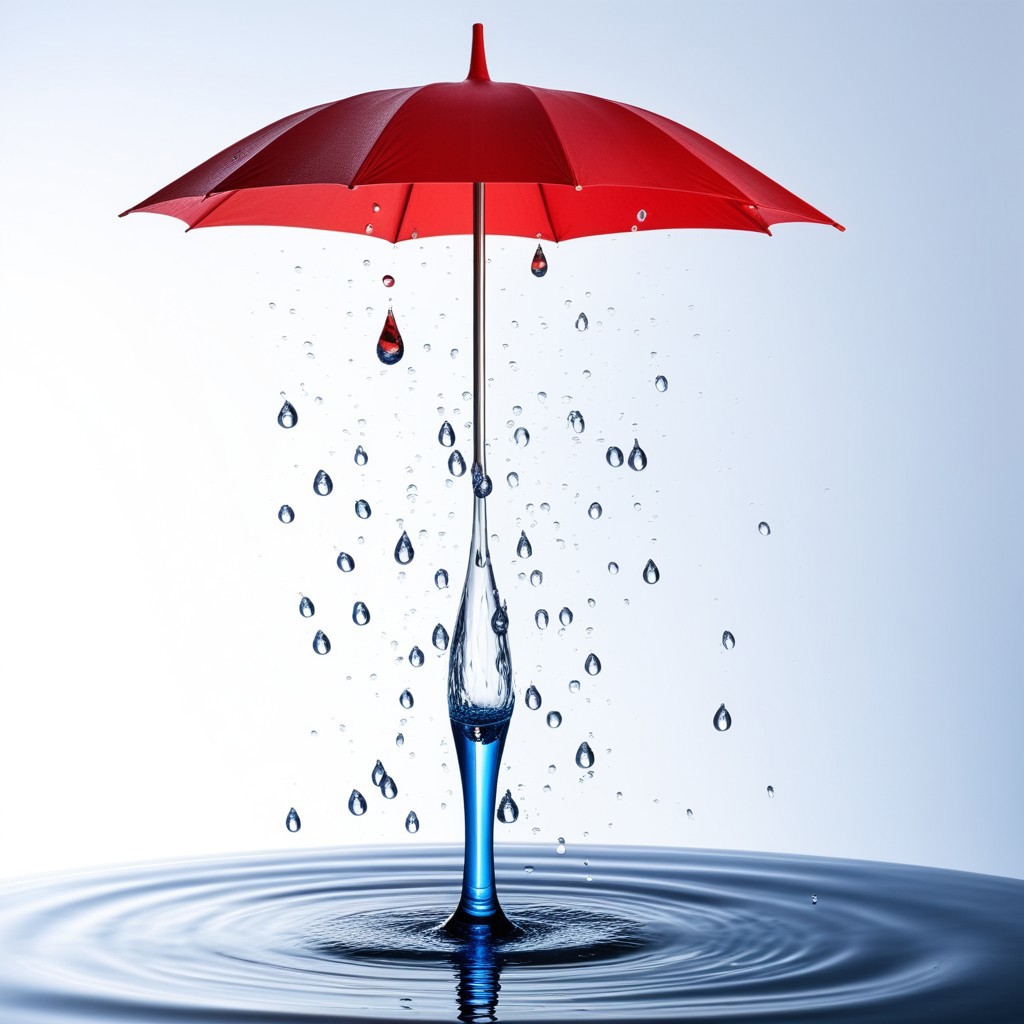 A red drop of water falling on still water creates a deep effect, the drop of water creates a column of water rising upwards. a second blue drop falls on top of the column, it takes the shape of an umbrella, the environment is illuminated by strobe lights, the background is smooth white