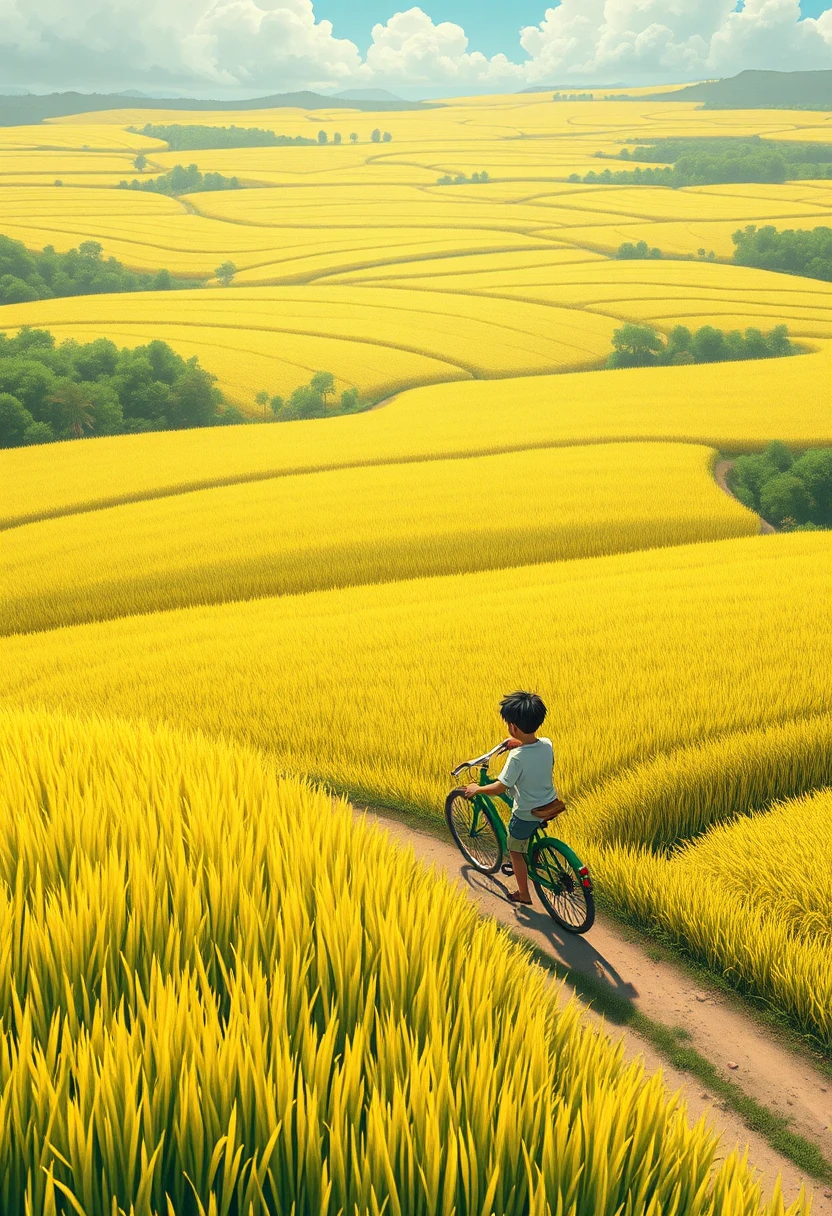 Very beautiful anime illustration, Endless rice fields, half yellow half green, a boy riding a bicycle, Will Barnett (Will Barnet) modeling, Attached are 50D movie stills, Idyllic, Rural, panoramic. In the style of Hayao Miyazaki, Hiroshi Nagai, Hergé and Studio Ghibli. High resolution, high cartoonish high intricate, ultra detailed, high quality, high sharpness, high contrast, beautiful, high octane render, high definition.