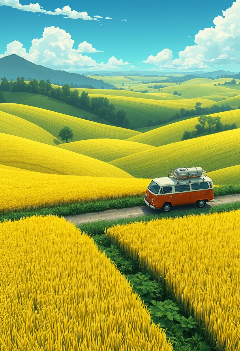 Very beautiful anime illustration, Endless rice fields, half yellow half green, Volks Wagen Van moving on there, Will Barnett (Will Barnet) modeling, Attached are 50D movie stills, Idyllic, Rural, panoramic. In the style of Hayao Miyazaki, Hiroshi Nagai, Hergé and Studio Ghibli. High resolution, high cartoonish high intricate, ultra detailed, high quality, high sharpness, high contrast, beautiful, high octane render, high definition.