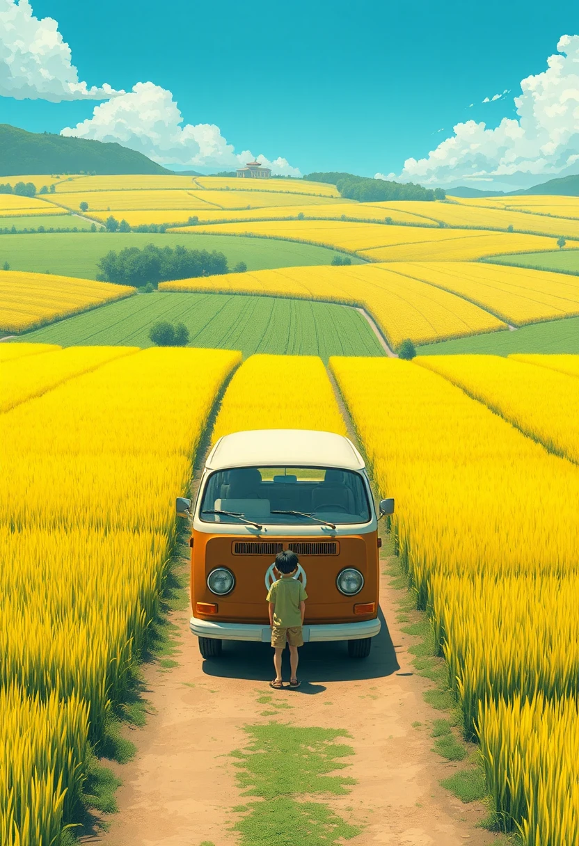 Very beautiful anime illustration, Endless rice fields, half yellow half green, Volks Wagen Van there, and a boy standing in-front of the van. Will Barnett (Will Barnet) modeling, Attached are 50D movie stills, Idyllic, Rural, panoramic. In the style of Hayao Miyazaki, Hiroshi Nagai, Hergé and Studio Ghibli. High resolution, high cartoonish high intricate, ultra detailed, high quality, high sharpness, high contrast, beautiful, high octane render, high definition.