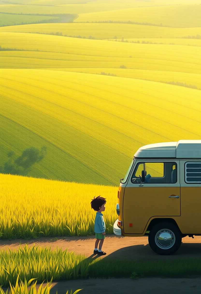 Very beautiful anime illustration, Endless rice fields, half yellow half green, side view of Volks Wagen Van there, and a boy standing in-front of the van. Will Barnett (Will Barnet) modeling, Attached are 50D movie stills, Idyllic, Rural, panoramic. In the style of Hayao Miyazaki, Hiroshi Nagai, Hergé and Studio Ghibli. High resolution, high cartoonish high intricate, ultra detailed, high quality, high sharpness, high contrast, beautiful, high octane render, high definition.