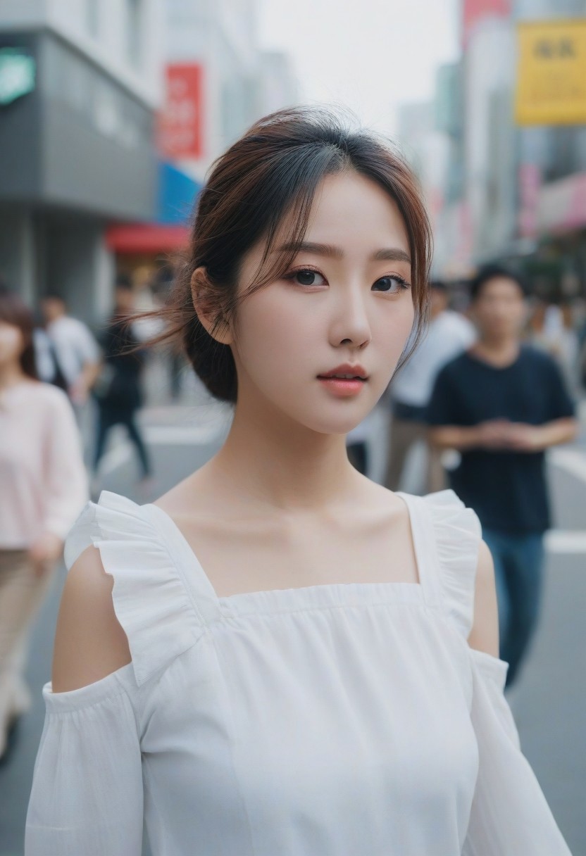 Realistic photograph, film grain, 8k, Best quality, score_9, score_8_up, score_7_up, score_6_up, (kawaii), K-pop idol, a half-body shot of a graceful and beautiful Korean woman walking in a busy city street.