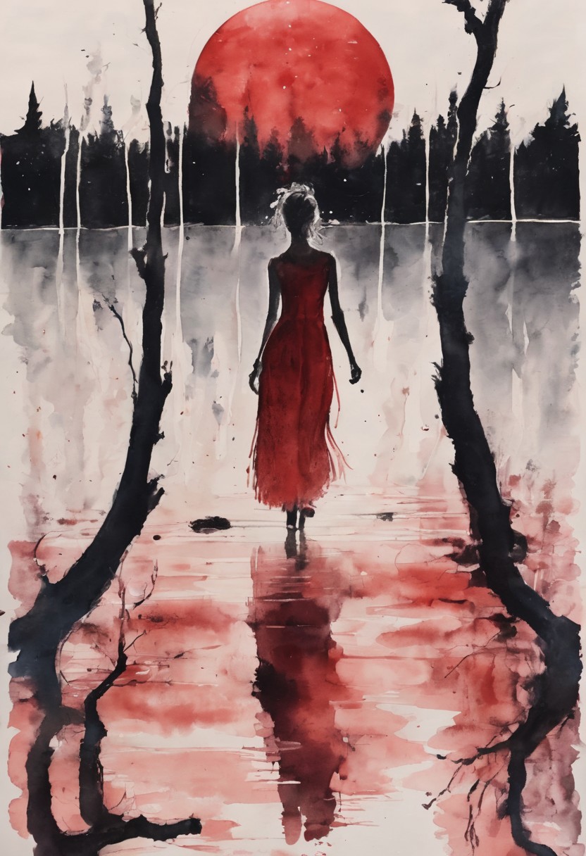 Create a ink illustration matserpiece hauntingly scene of a woman standing in red water in a forest, surrounded by high trees, under a red moon, and red water, the woman's red dress, the water and the moon are the only splashes of color, ink splashes, rough ink sketch, moody, gloomy, dark picture, highly detailed, award winning g, high contrast, stylized, linquivera, liiv1