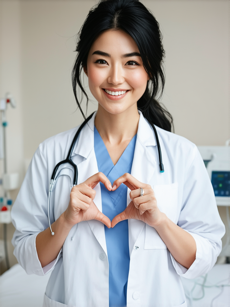 masterpiece,best quality,4k,(cowboy shot),1girl, (making heart with hands), smiling beautiful Japanese female doctor wearing white labcoat over scrubs, beautiful detailed face, black hair, pale skin, realistic skin, detailed cloth texture, detailed hair texture, Perfect proportion, accurate, Anatomically correct, Highly detailed face and skin texture, modern hospital bed, photorealistic, looking at viewer