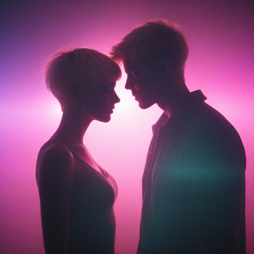 Silhouette of a Young couple, woman has pixie hair cut, blonde, hazy, foggy, neon lights break through the dense fog, artsy, pop album cover shot, graphic design background, synthpop, electro-funk