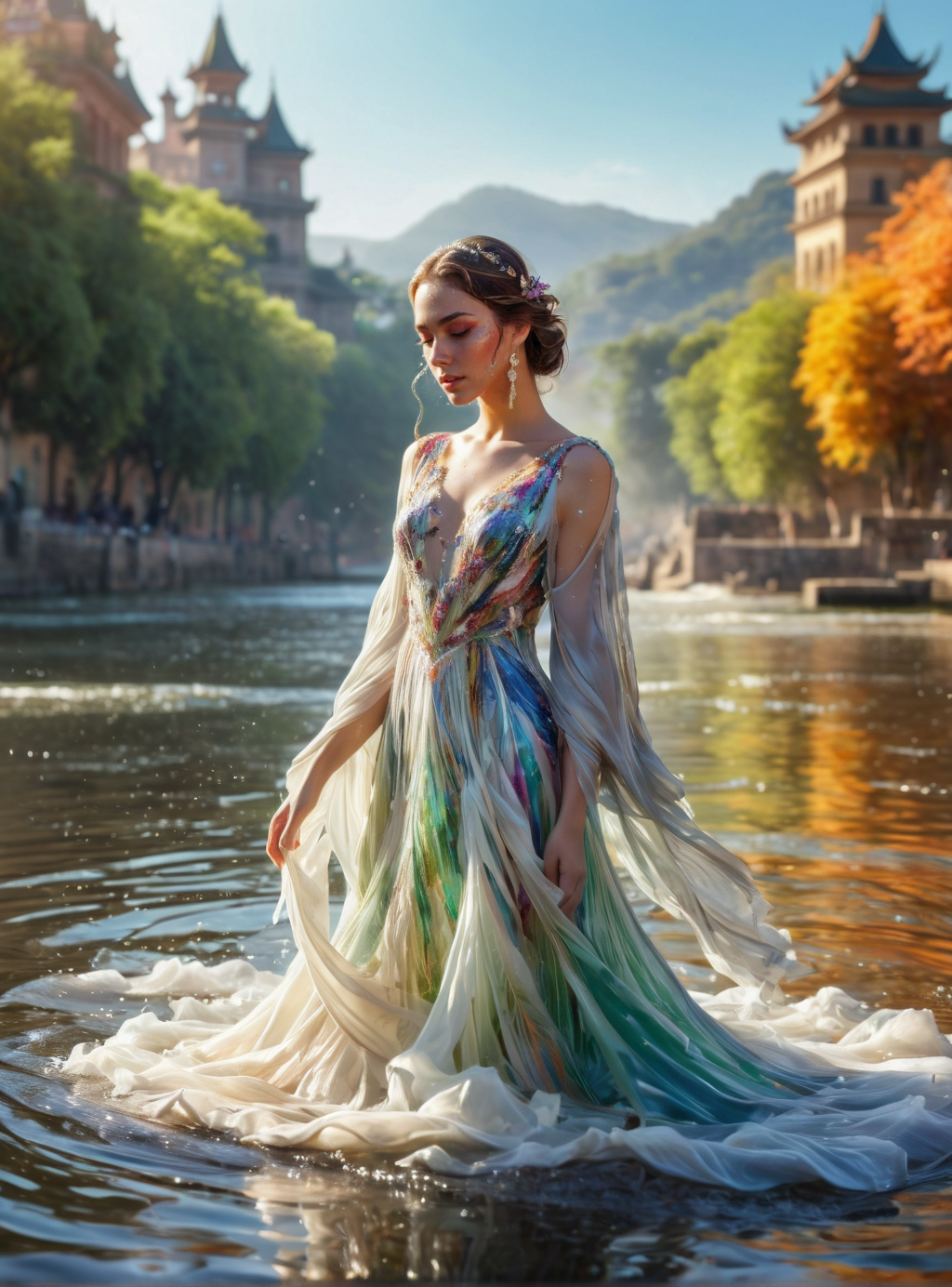 1Female, (masterpiece:1.2), best quality, multicolored, masterpiece, best quality, (an extremely delicate and beautiful:1.21), floating, (detailed wet clothes:1.10), (detailed light:1.10), feather, nature, (sunlight:1.10), river, floating palace, beautiful and delicate water, (bloom:1.10), (shine:1.10), colorful, dynamic vivid colors, panorama, landscape, Colorful portraits, dynamic lighting.