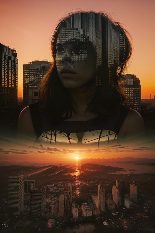 masterpiece, double exposure, ellie shadow silhouette on the side, ellie bow and backpack, face and neck image, huge boobs, filled with a ruined city vegetated at sunset, double exposure background, hyper detailed,