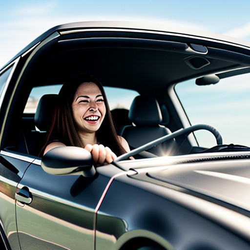Photo, high resolution, detailed, open sports car, pretty young woman sitting in it, long hair floating in the wind, laughs