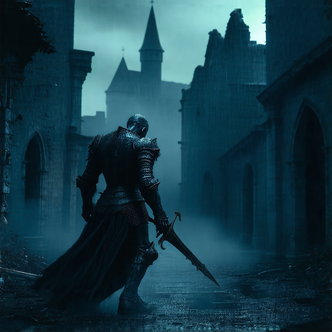 cinematic high resolution realistic photo still of a dark night wearing a medieval armor,dark setting,horror mood,he is in the middle of a street in a ruined dark fantasy city fighting an undead zombie,raining,there is a lot of fog,the depth of field enhance the photo,the photo is extremely detailed,high resolution,high quality